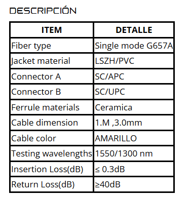 PATCHCORD SM Simplex G657 SC/APC- SC/UPC 3mm 1 MTS LSZH